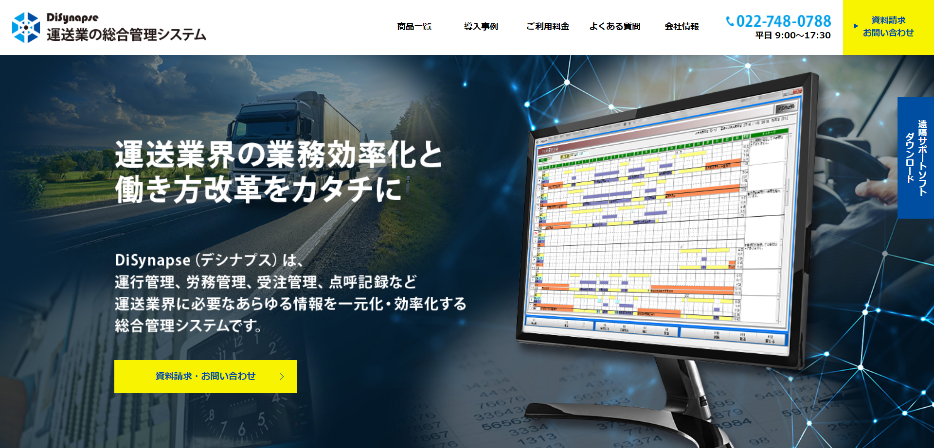 DiSynapse(デシナプス)は、運行管理をはじめ、受注管理や点呼記録など運送業に欠かせない情報を一元化する管理システムです。膨大な時間と手間がかかる管理業務を、スムーズかつ効率よく管理してくれます。